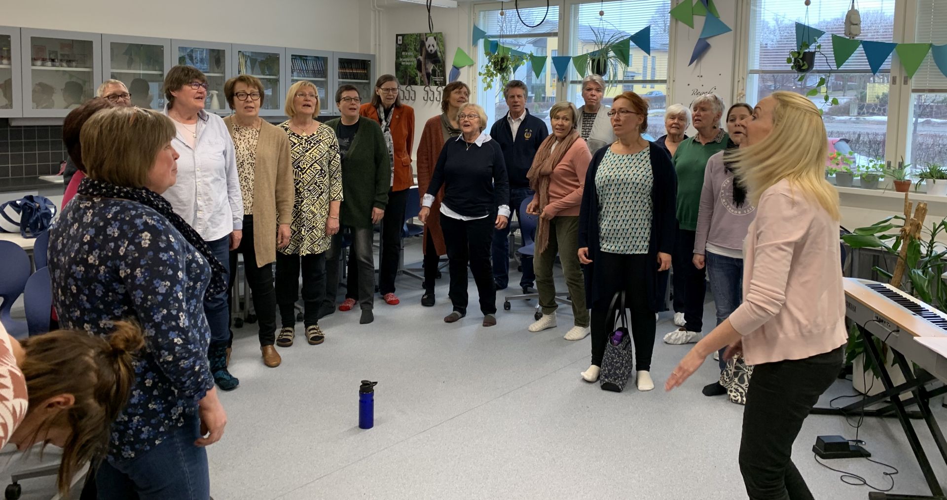 Övning med Hanna Kronqvist. 13.2 var Amanda bortrest och vi fick Hanna som vikarie. Det är alltid hälsosamt att emmellanåt ha en annan dirigent alla har något nytt att ge. Vi jobbade bl. a. med klang och renhet. En sak som Hanna brukar experimentera med är att placera om koristerna. Bara genom att två personer i en stämma byter plats kan det bli helt olika sound i kören. Detta var verkligen spännande, man borde ha mera tid att testa på det.