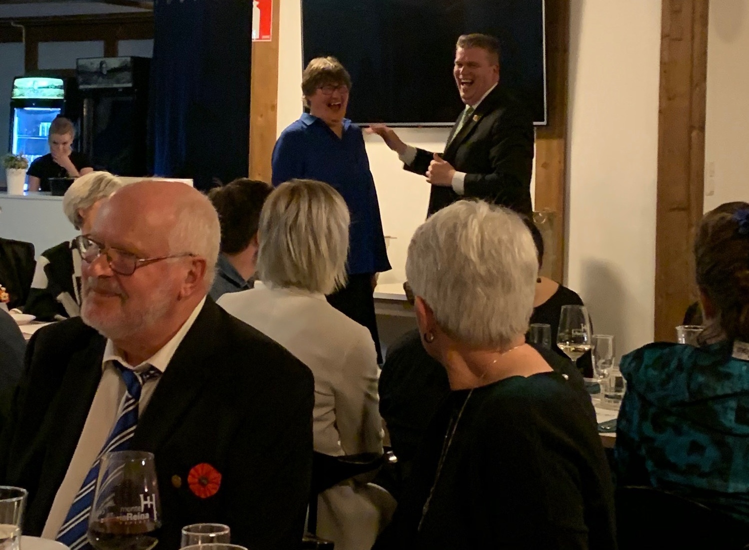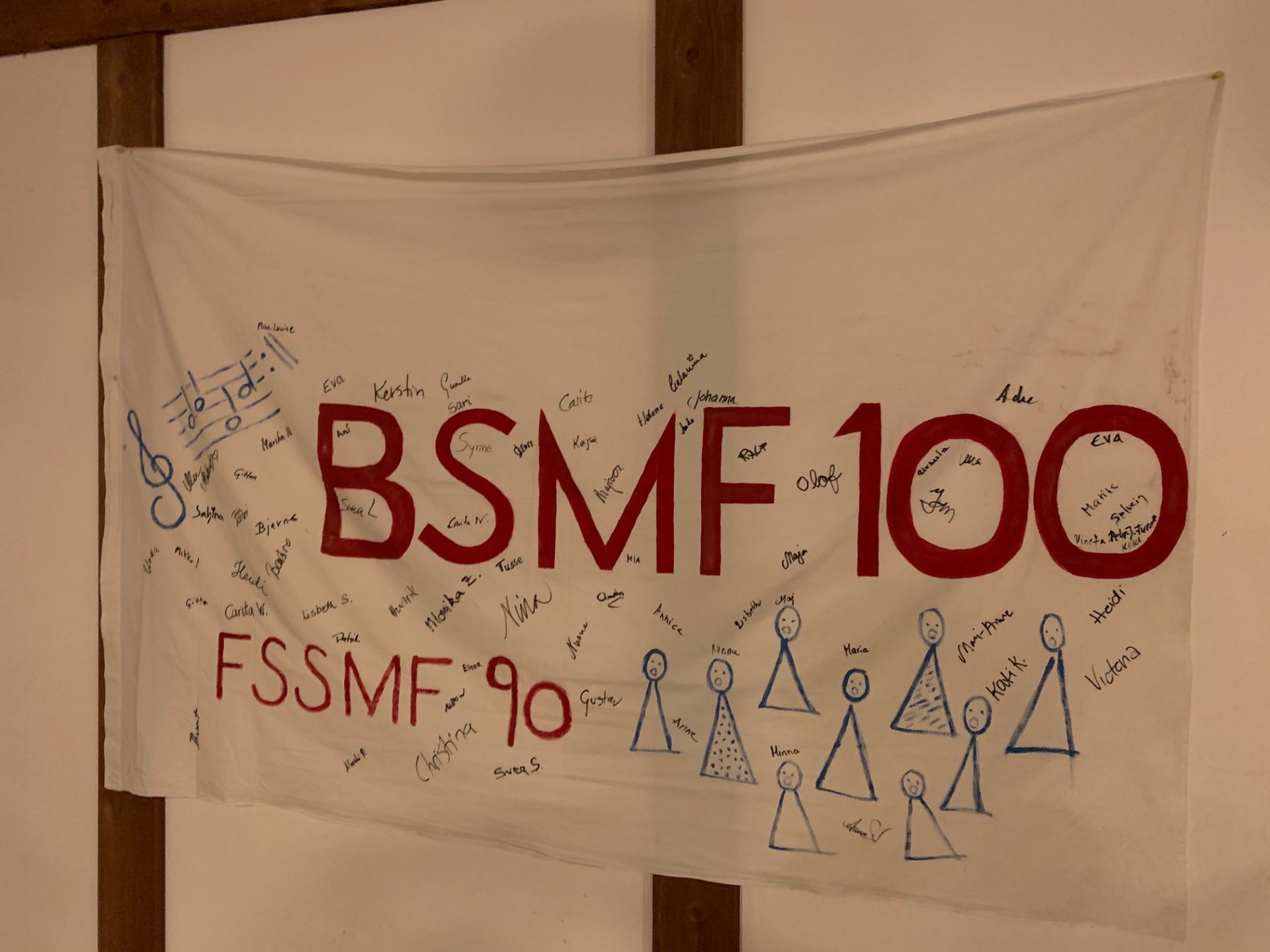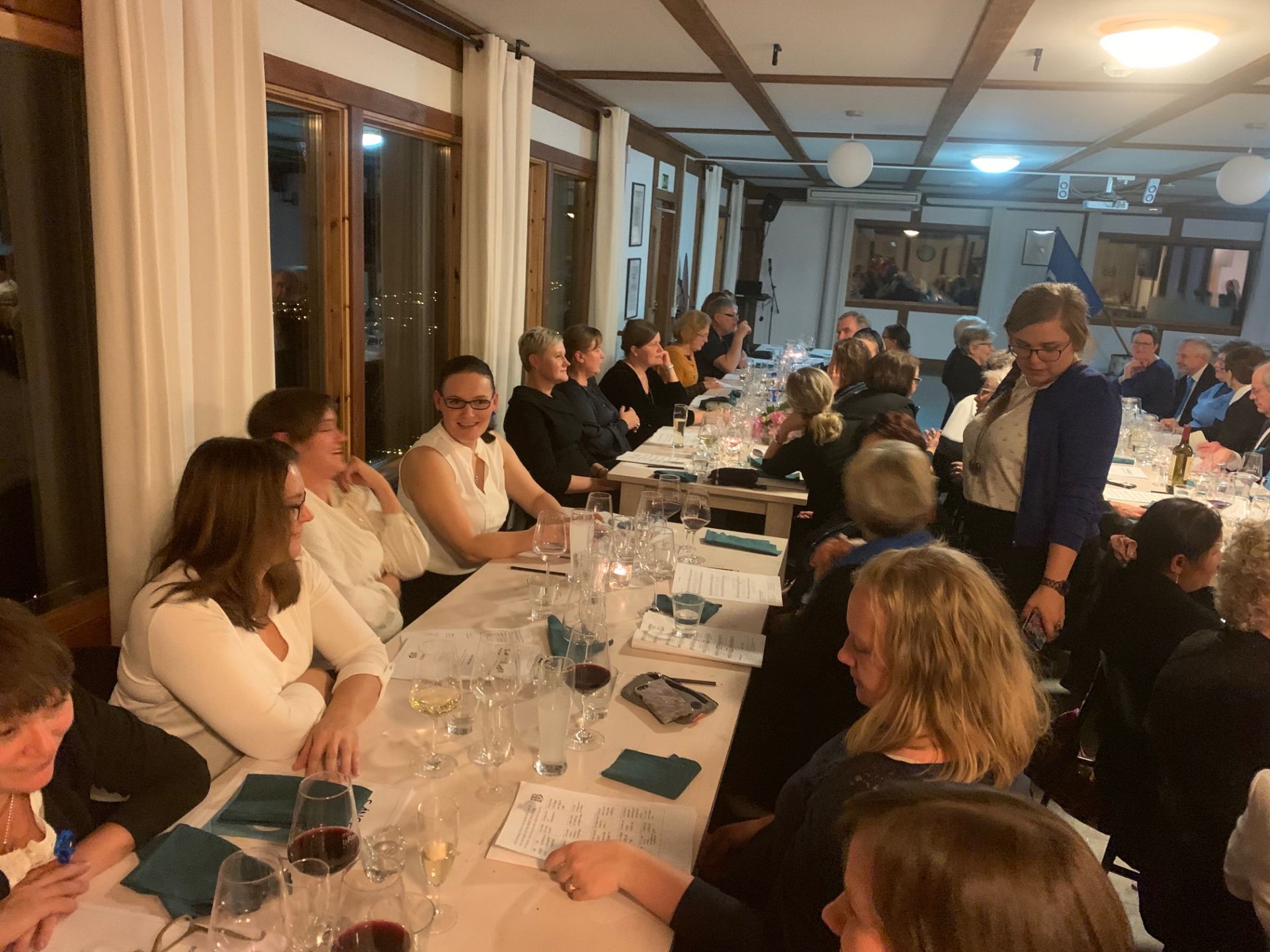 BSMFs 100-års jubileumssits i Poukama 9.11. Efter mässan var det en upprymd skara sångare som med bilar och buss körde till Poukama på Emsalö för att festa. Vi hann bara sökas oss till våra platser så var vi på grund av brandalarm tvungna att stiga upp och gå ut. Länge behövde vi dock inte stå ute och frysa innan vi släpptes in igen. Kvällen fortsatte med mat och dryck, förstås, men även med sång, tal, lek, tävling och som sig bör vid ett jubileum, uppvaktningar. Förutom de vanliga BSMF märkena med 10, 20, 30, 40 osv rosetter blev Carita Björkestam, som förutom att hon är Alvakörens ordförande även är BSMFs orförande, förärad FSSMFs förtjänstmärke. Vilket hon var väl värd efter att hon förtjänstfullt har lyckats hålla i alla trådar för förbundets jubileumsår. Patrik Karlsson, FSSMFs ordförande, fanns på plats och överräckte märket till en överraskad Carita.