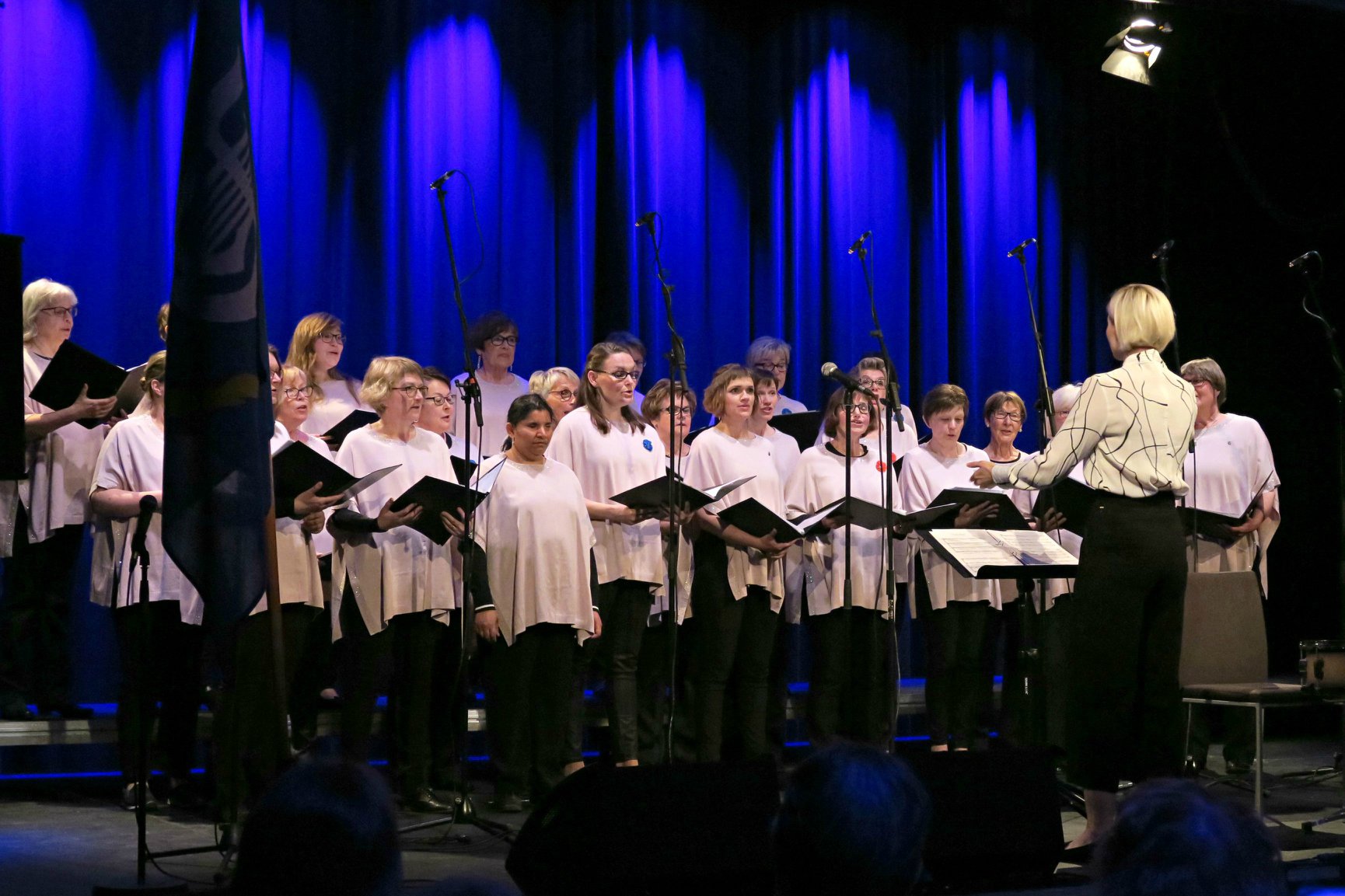 Jubileumskonserten PÅ VÄG nr 2, 4.5 i Nickby Festsal i Sibbo. Nu var vi redan varma i kläderna och vi visste att det går bra under Jessicas ledning. Det var dessutom bättre att höra varandra i denhär salen, så vi behövde inte vara lika nervösa som i Borgå. Alvakörens eget program löpte som smort tyckte vi och vi hörde t.o.m. bravo rop efter att vi framfört "Hvem styrde hit din väg"! På tal om kläder så invigde vi också vår nya kördräkt. Stiligt!